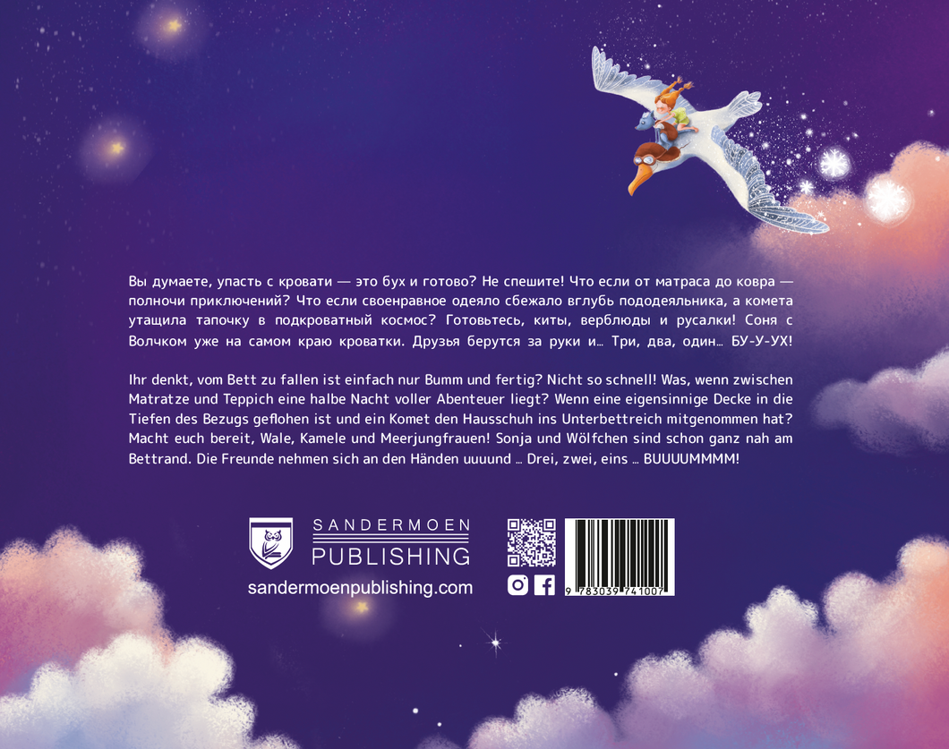 RU. Вы думаете, упасть с кровати – это бух и готово? Не спешите! Что если от матраса до ковра — полночи приключений? Что если своенравное одеяло сбежало вглубь пододеяльника, а комета утащила тапочку в подкроватный космос? Готовьтесь, киты, верблюды и русалки! Соня с Волчком уже на самом краю кроватки. Друзья берутся за руки и... Три, два, один... БУ-У-УХ!