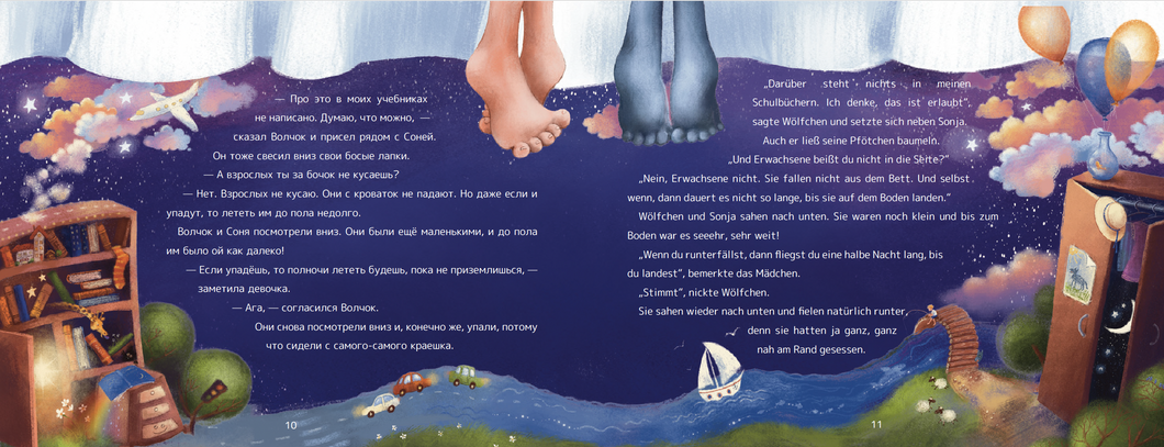 Macht euch bereit, Wale, Kamele und Meerjungfrauen! Sonja und Wölfchen sind schon ganz nah am Bettrand. Die Freunde nehmen sich an den Händen uuuund ... Drei, zwei, eins ... BUUUUMMMM!