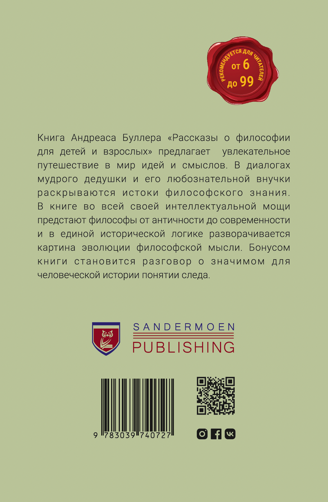 Книга Андреаса Буллера «Рассказы о философии для детей и взрослых» предлагает увлекательное путешествие в мир идей и смыслов. В диалогах мудрого дедушки и его любознательной внучки раскрываются истоки философского знания. Вместе с внучкой Кларой и автором читатель знакомится с разными философскими учениями и породившими их культурными эпохами. В книге во всей своей интеллектуальной мощи предстают философы от античности до современности и в единой исторической логике разворачивается картина эволюции философской мысли. Бонусом книги становится разговор о значимом для человеческой истории понятии следа.